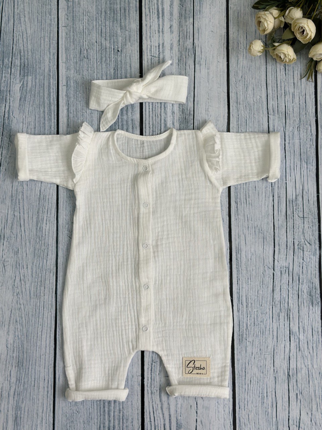 Теги: Купить оптом детский комбинезон . 336-МО. Комбинезон с повязкой для девочки из муслина, хлопок 100%, размеры 56,62,68, молочный цена,отзывы официальный сайт "Стеша Белгород"